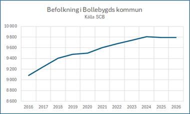 Sedan 2024 har den tidigare stabila befolkningsökningen avstannat, se nedanstående diagram.  Under 2019 – 2022 hade vi en ordnad årlig tillväxt på 1-1,5 %. Nu minskar befolkningen. Vilket misslyckande av de som styr kommunen. Kommunen har i stort sett ingen inflyttning. Det kommunala bostadsorganet, stiftelsen Bollebo, har inte byggt några bostäder under perioden.